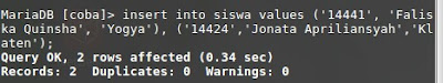 Dari gambar tersebut, saya menambahkan 2 data pada tabel. Untuk values itu perintah untuk memberi isian.